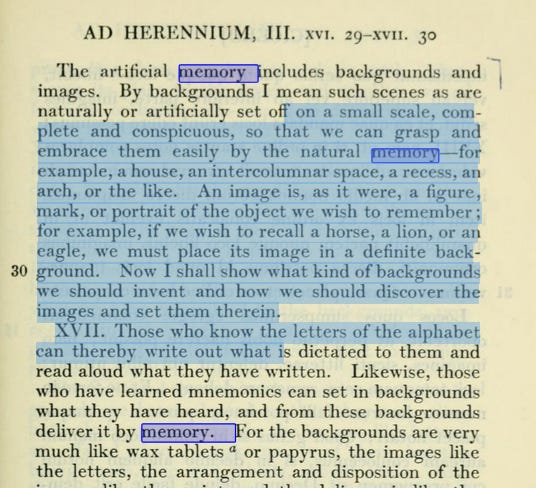 I had been looking through a famous classical book on rhetoric, the Rhetorica ad Herennium, because at the moment I am fascinated by memory, and there’s lots on memory in here.