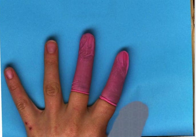 I love it because it is a surprise, but also because it is a perfect scrambled misreading of the instructions above. Five fingers-ish (one of them a strange grey blur) against a blue background, slipped between two identical copies of the same blank page numbered ‘70’. Two fingers covered in pink glove, the other two showing traces of pink shimmery nail varnish. And two little wounds at the base of the little finger, too. I hope this person in 2010 was ok. I remember I was ok that year, then suddenly I wasn’t.